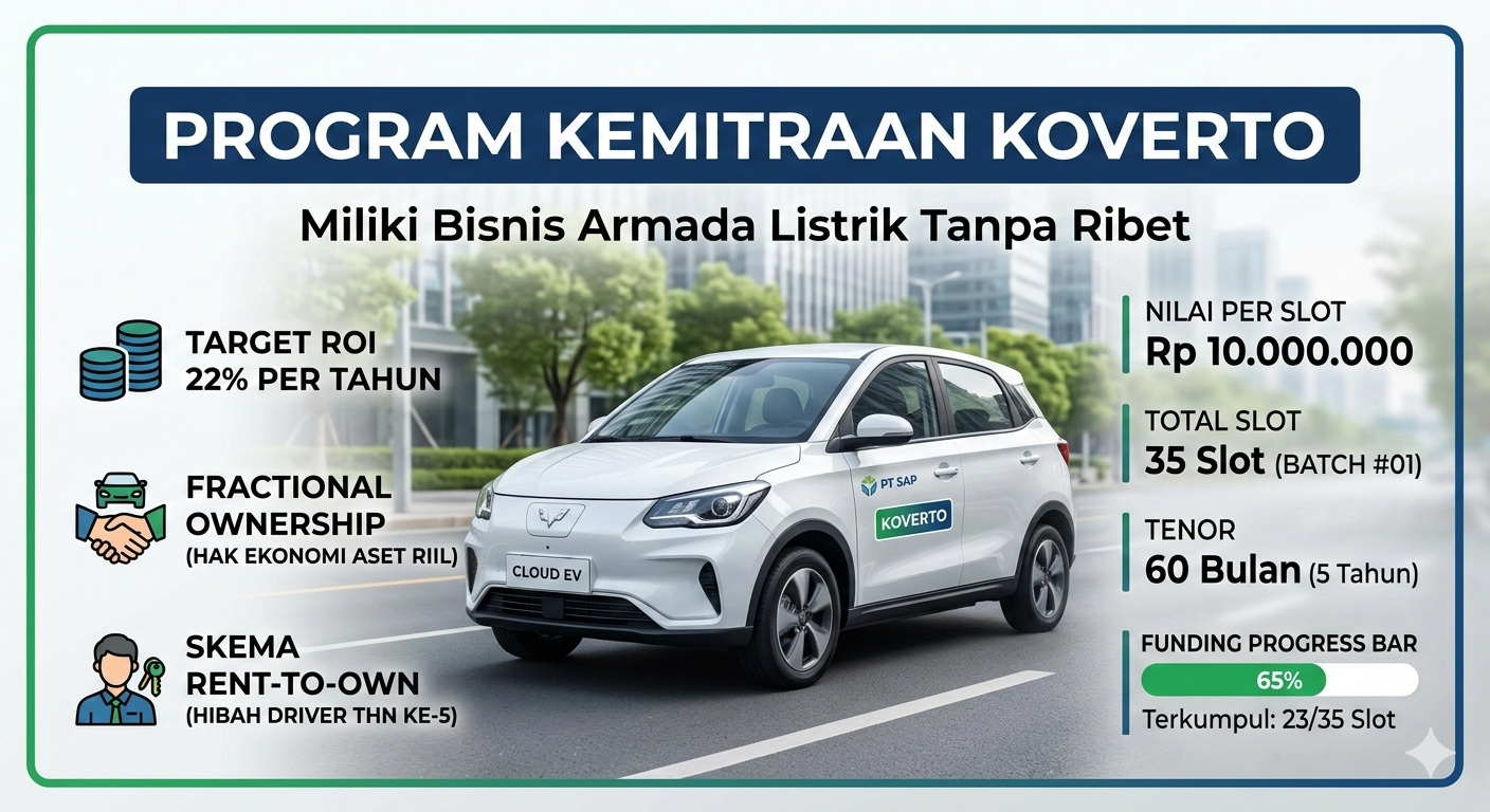 Bergabunglah dalam ekosistem transportasi berkelanjutan bersama PT Sherita Asia Pratama (SAP). Melalui program Koverto, Anda dapat memiliki bagian dari armada Wuling Cloud EV yang dikelola secara profesional untuk kebutuhan fleet orchestration.